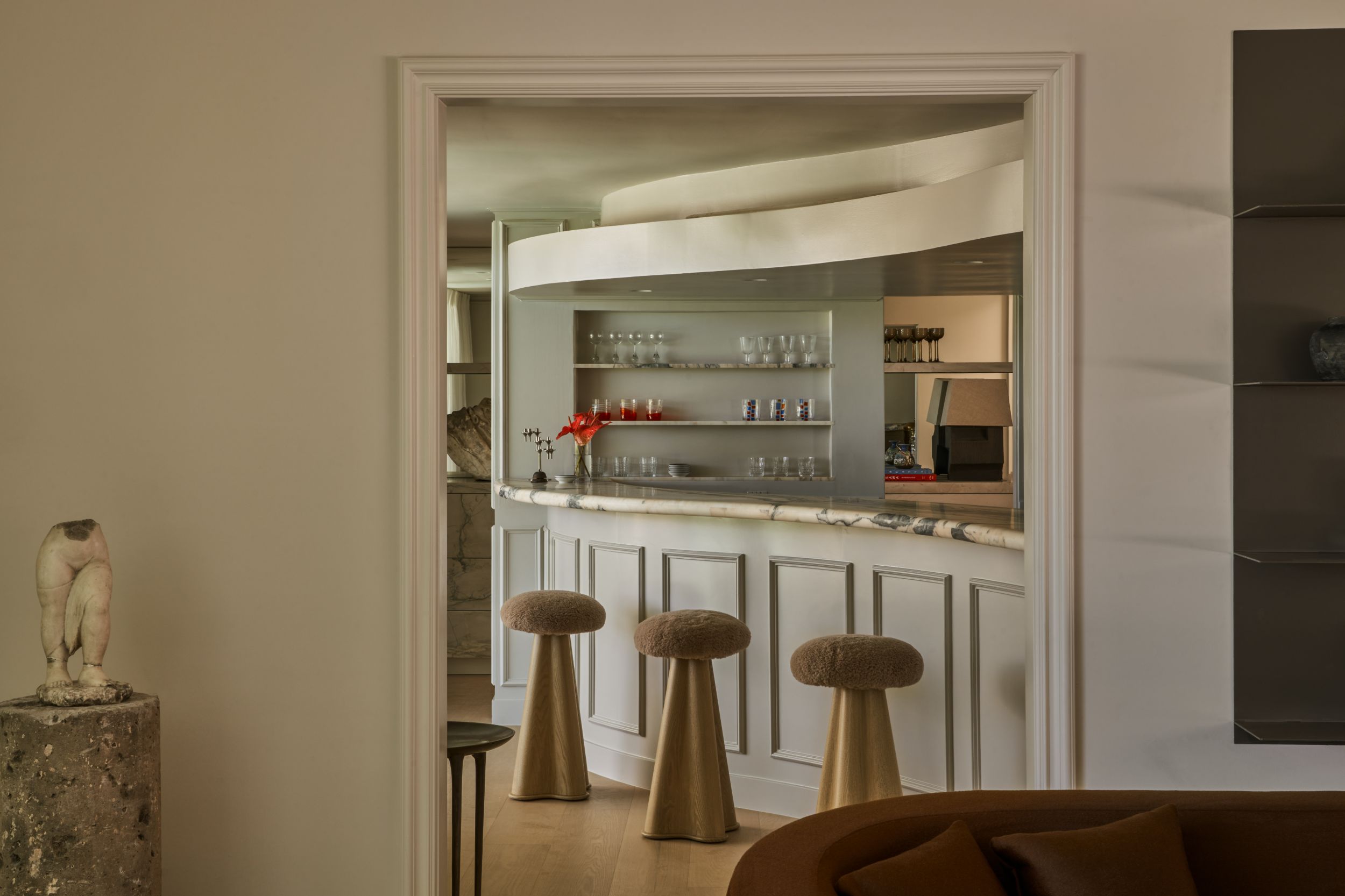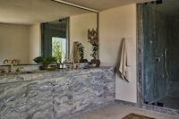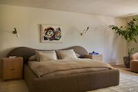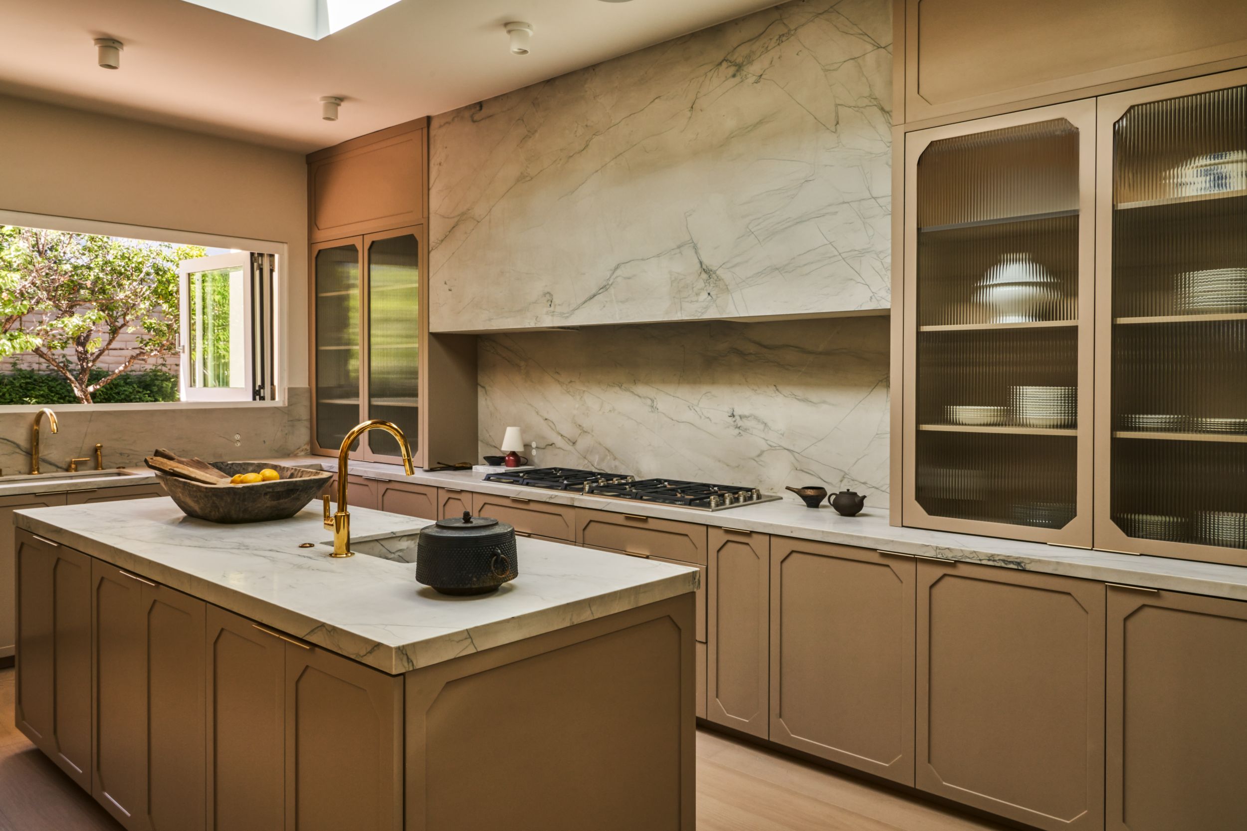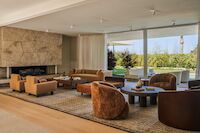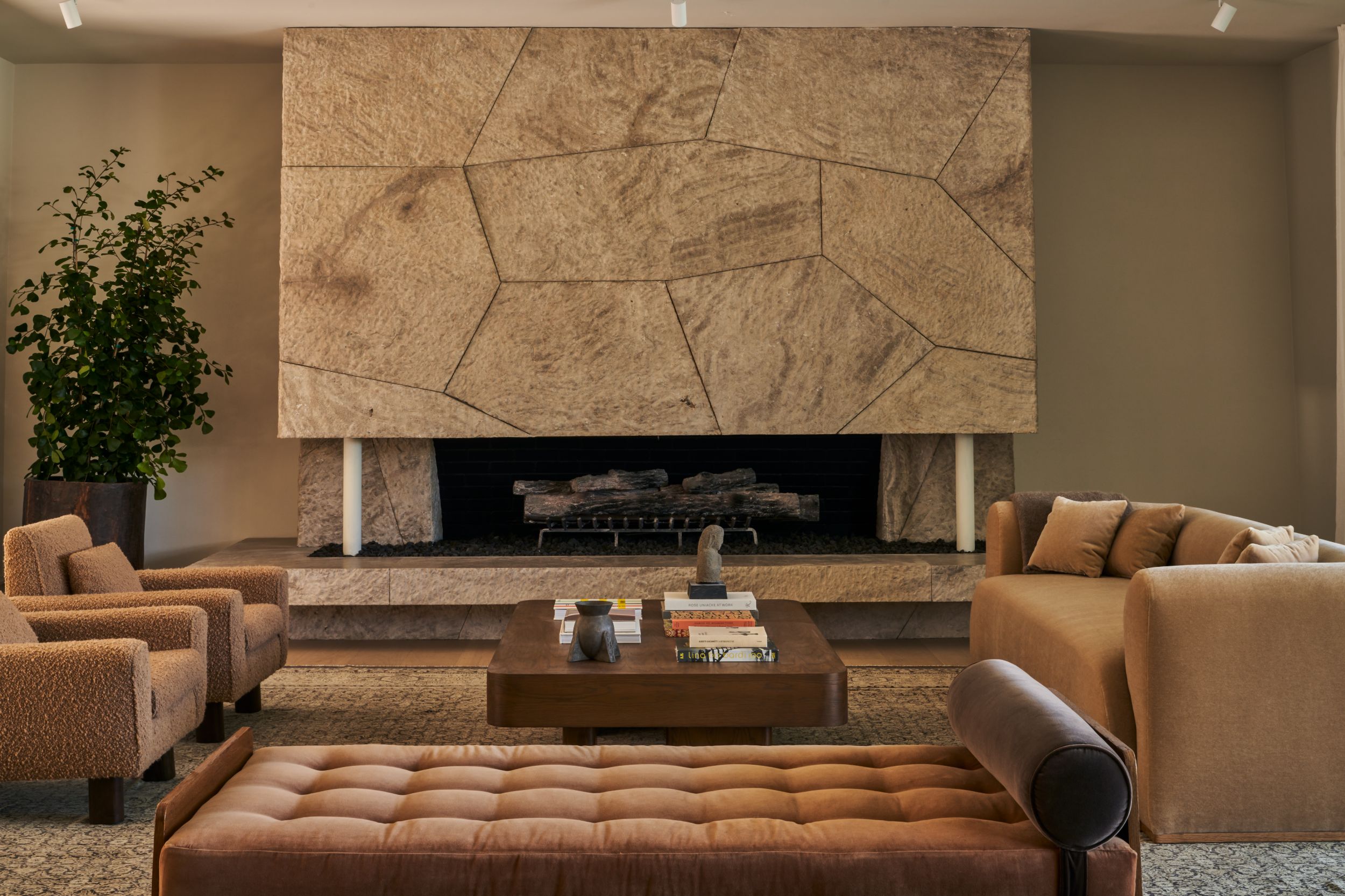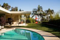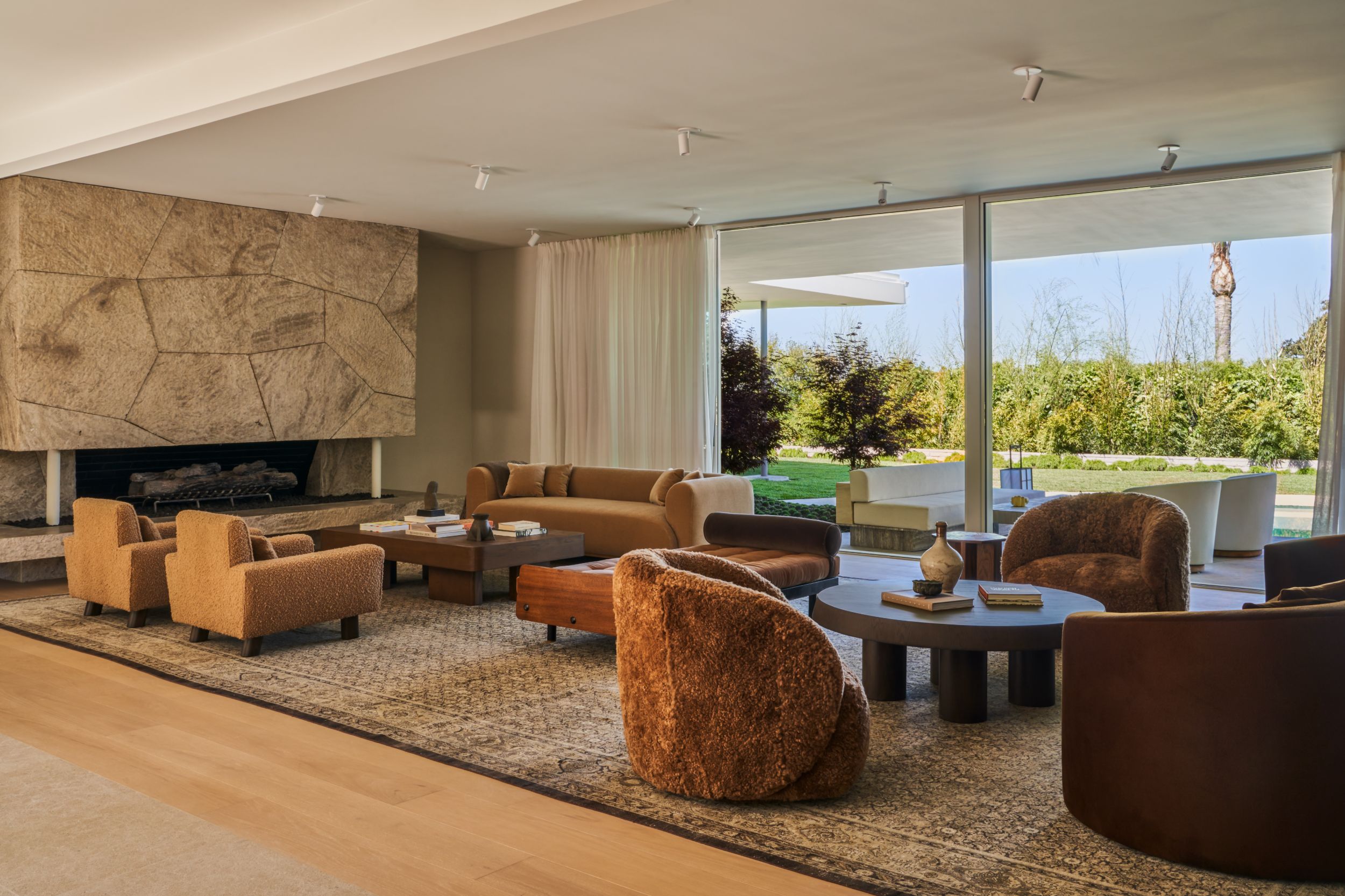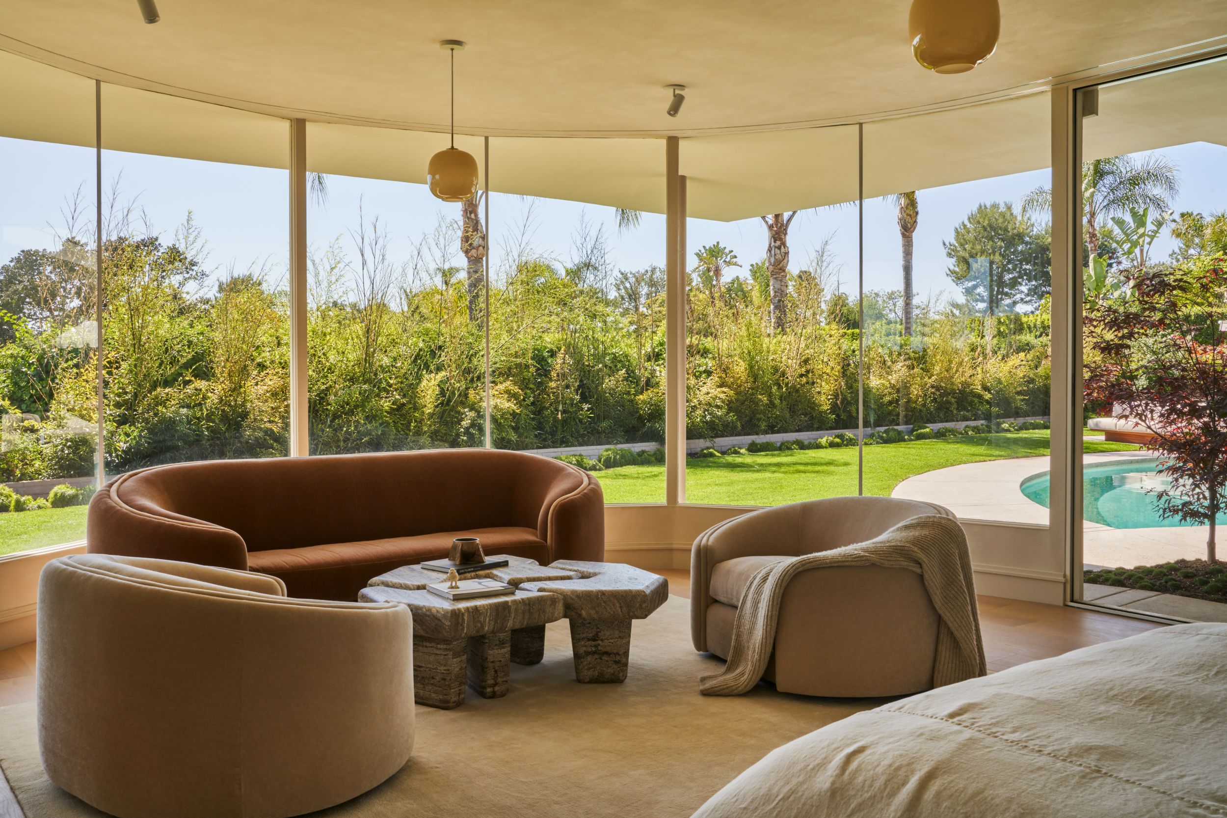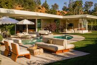 One of the best architectural mid-century homes built in Trousdale on a flat half-acre lot with city views of West LA, OSKLO House is an approx. 6,200 SF estate by Benton & Parks AIA, 1966, that has been completely reimagined by OSKLO. A dramatic courtyard with a sculptural fountain frames the front entrance to this fully furnished turn-key home. The living room, with oversized fireplace and floor-to-ceiling windows, creates a stunning entrance to this mid-century masterpiece. A collection of custom OSKLO furnishings, museum-level antiquities, and vintage pieces throughout the home perfectly accent the materials and finishes. No expense was spared. The kitchen is the epitome of Beverly Hills living with breakfast nook, butler's pantry, and a panel of windows that open to an outdoor garden. The unparalleled primary suite showcases nearly $1-million of stonework and offers wraparound windows that look out over the backyard with city lights in the distance. A long hallway overlooks the Japanese-inspired atrium and leads to 3 ensuite bedrooms. An additional ensuite bedroom near the kitchen as well as a pool bath near the outdoor cabana make this the perfect home for entertaining/hosting family and guests. Outside the angular pool pavilion features multiple gathering areas, a swimming pool, firepit, and outdoor bar. This home is the epitome of Trousdale mid-century indoor/outdoor living.